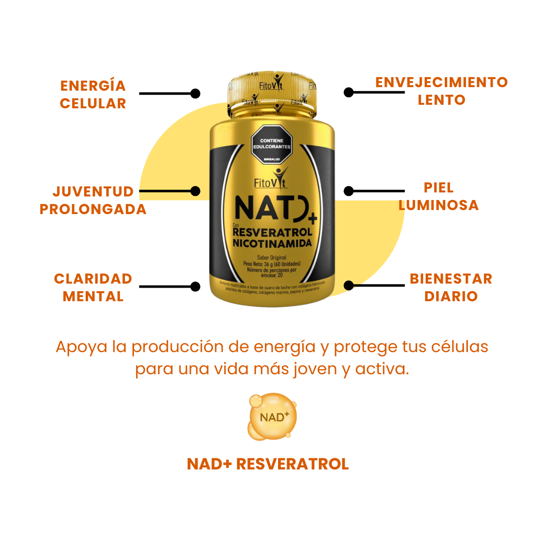 ¿Buscas combatir el envejecimiento celular de forma práctica y deliciosa? Estas gomitas masticables combinan resveratrol y nicotinamida con colágeno, vitaminas y minerales para apoyar tu salud celular, regeneración de tejidos y protección antioxidante.